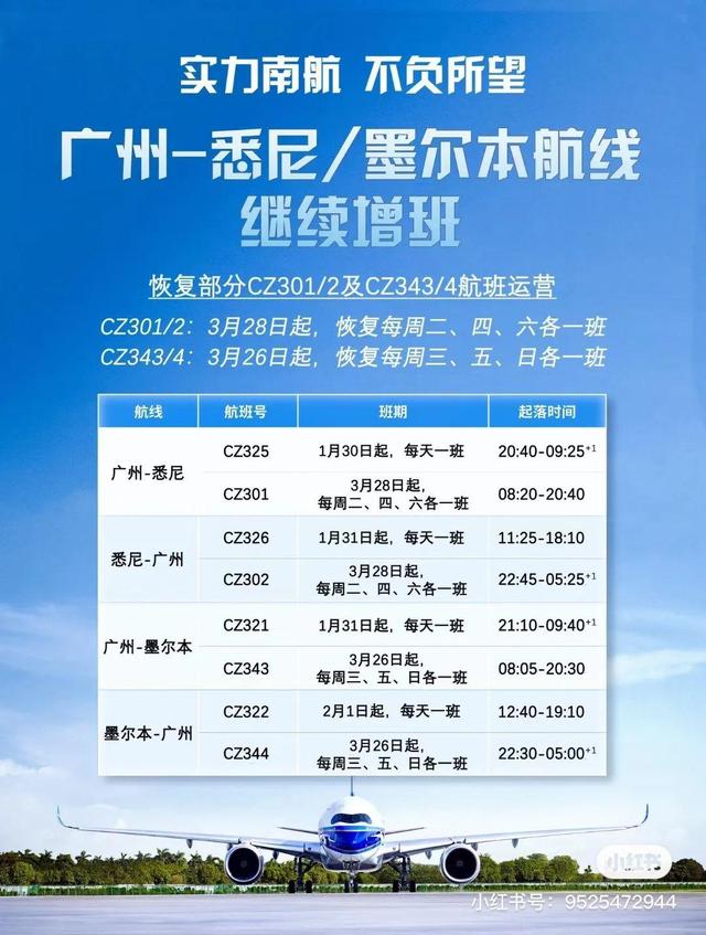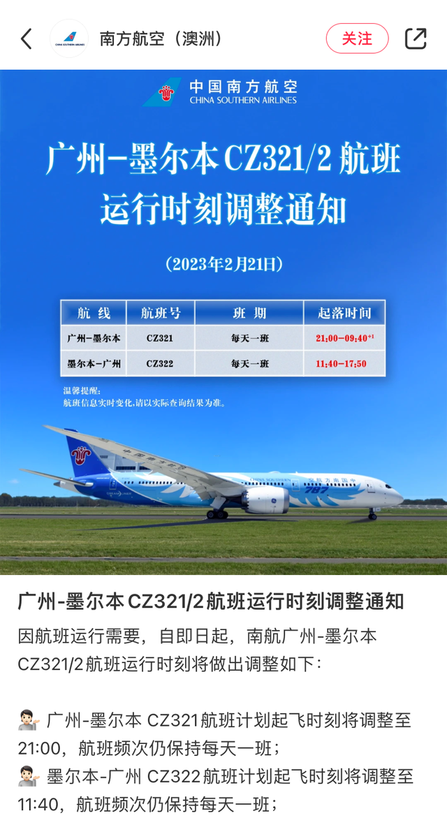 近日,南航澳洲官方发布一则公告:广州-墨尔本CZ321/2航班运行时刻调整通知!公告称:因航班运行需要,自即日起,南航广州-墨尔本CZ321/2航班运行时刻将做出调整如下: