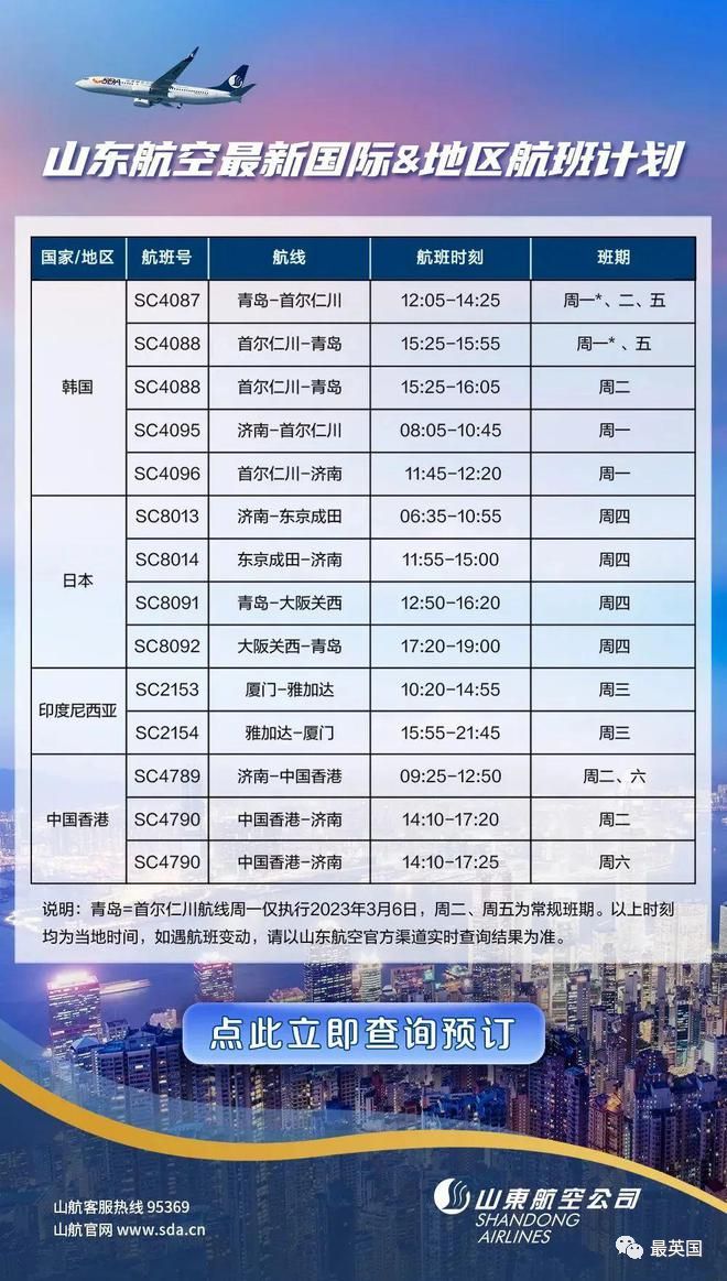 目前,山航每周执行两班济南=中国香港航班,随着政策不断优化,山航将持续增加航班执行频次。