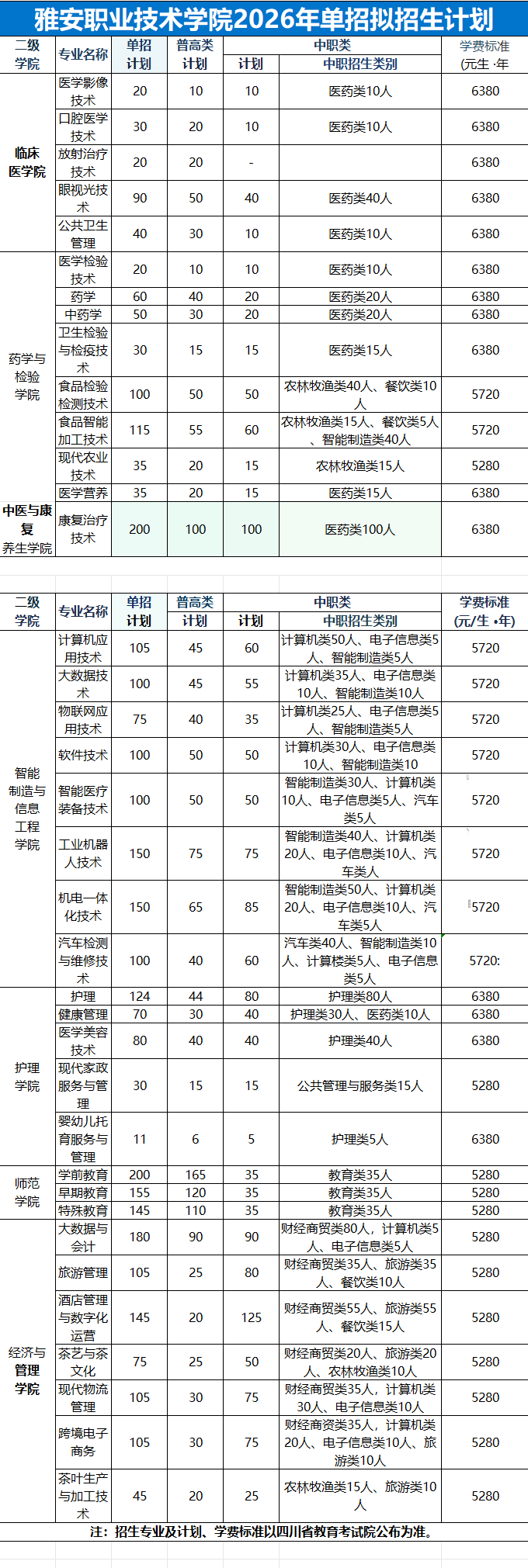 【公办】雅安职业技术学院2026年单独招生专业计划(附历年单招录取控制线)
