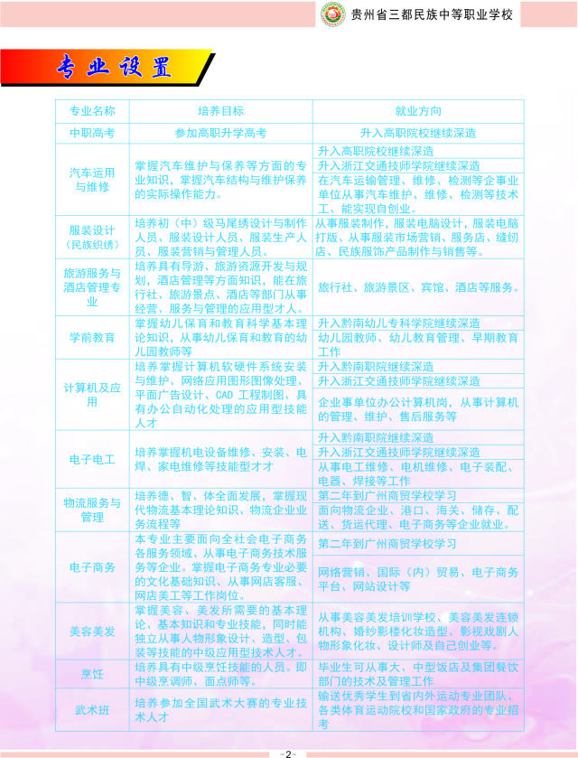 三都水族自治县是全国独一的水族自治县,三都民族中等职业学校是三都水族自治县独一一所融中等职业教育、成人高等学历教育和返乡创业农民工技艺培训效劳为一体的,为县域经济社会开展培育初级、中级、高级综合型技艺人才的中等职业学校。学校位于珠江水系源头都柳江畔三都县城猴场开发新区,学校占空中积300多亩,目前,学校教职工145人,在校学生2151人。学校重点打造四大专业,一是机电与车辆学部为重点专业,二是民族织绣学部为特征专业,三是旅游酒店管理为品牌专业,四是电商物流为优先开展专业。