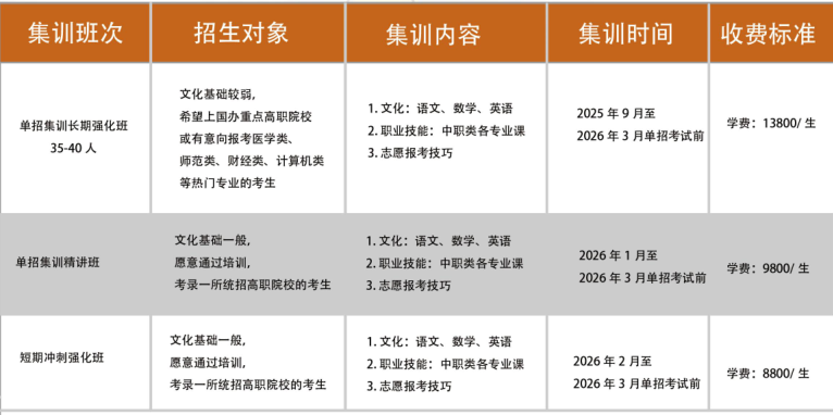 成都竞元单招培训学校针对2026年高职单招开设中职单招培训班,包含:医药护理类、教育类、财经商贸类、土木水利类、农林牧渔类、智能制造类、计算机类、电子信息类、汽车类、交通技术与服务类、旅游类、公共管理与服务类、材料化工与资源环境类等文化培训和专业技能培训。详细咨询:18780101560(吴老师)~