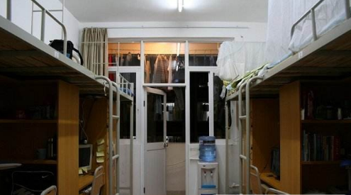 宿舍大多数都是六人一间,偶尔有八人一间的,洗漱间里早晚有热水,有四张桌子连着桌子上连着书架,四个柜子在一起。