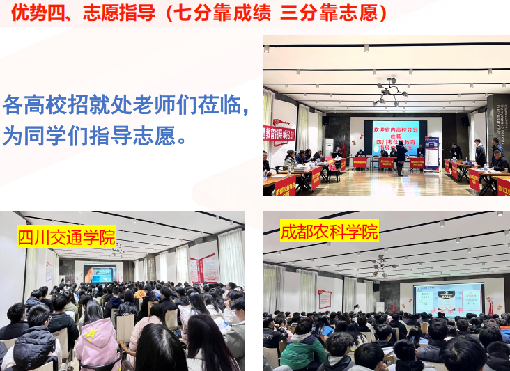 4、一对一志愿填报指导:新单招可谓七分靠成绩、三分靠志愿。所以单招的志愿填报非常重要,我校有邀请高校招生就业处领导现场来给学生做职业生涯讲座(家长也可以同步在线直播学习)、让学生对院校、专业有一个充分了解,杜绝专业信息差,让每一个孩子不仅能考上理想的学校,也能录取理想的专业。