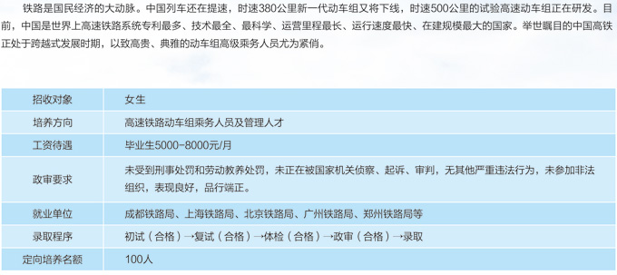铁路是国民经济的大动脉,中国列车还在提速,时速380公里新一代动车组又将下线,时速500公里的实验高速动车组正在研发,目前,中国是世界上调整铁路系统最全、集成能力最高、在建规模最大的国家,举世瞩目的中国高铁正处于跨域式发展时期,以致高贵、典雅的列车乘务员、客运人才尤为紧俏。